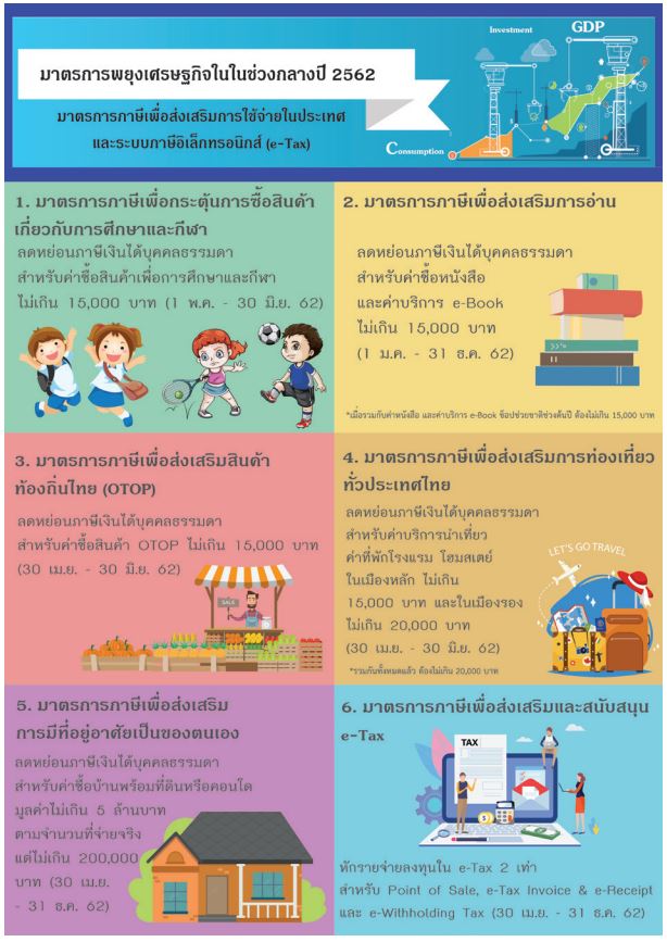 สรุปสาระสำคัญตามที่คณะรัฐมนตรีได้มีมติเห็นชอบมาตรการภาษีเพื่อพยุงเศรษฐกิจช่วงกลางปี 2562 ไปเมื่อวันที่ 30 เม.ย. 2562 ดังที่กระทรวงการคลังได้เสนอนั้น สำหรับการลดหย่อนภาษีเงินได้บุคคลธรรมดาไม่เกิน 15,000 บาท เมื่อซื้อสินค้าเกี่ยวกับการศึกษาและกีฬา ในช่วงระหว่างวันที่ 1 พ.ค. 2562 ถึง 30 มิ.ย. 2562 (อ้างถึง มาตรการฯ ข้อ2.2) และการซื้อหนังสือเพื่อส่งเสริมการอ่าน ในช่วงระหว่างวันที่ 1 ม.ค. ถึง 31 ธ.ค. 2562 แต่เมื่อรวมค่าซื้อหนังสือในรอบนี้กับค่าซื้อหนังสือของมาตรการช็อปช่วยชาติตั้งแต่วันที่ 1 - 16 ม.ค. 2562 แล้ว ต้องไม่เกิน 15,000 บาท (อ้างถึง มาตรการฯ ข้อ2.4)