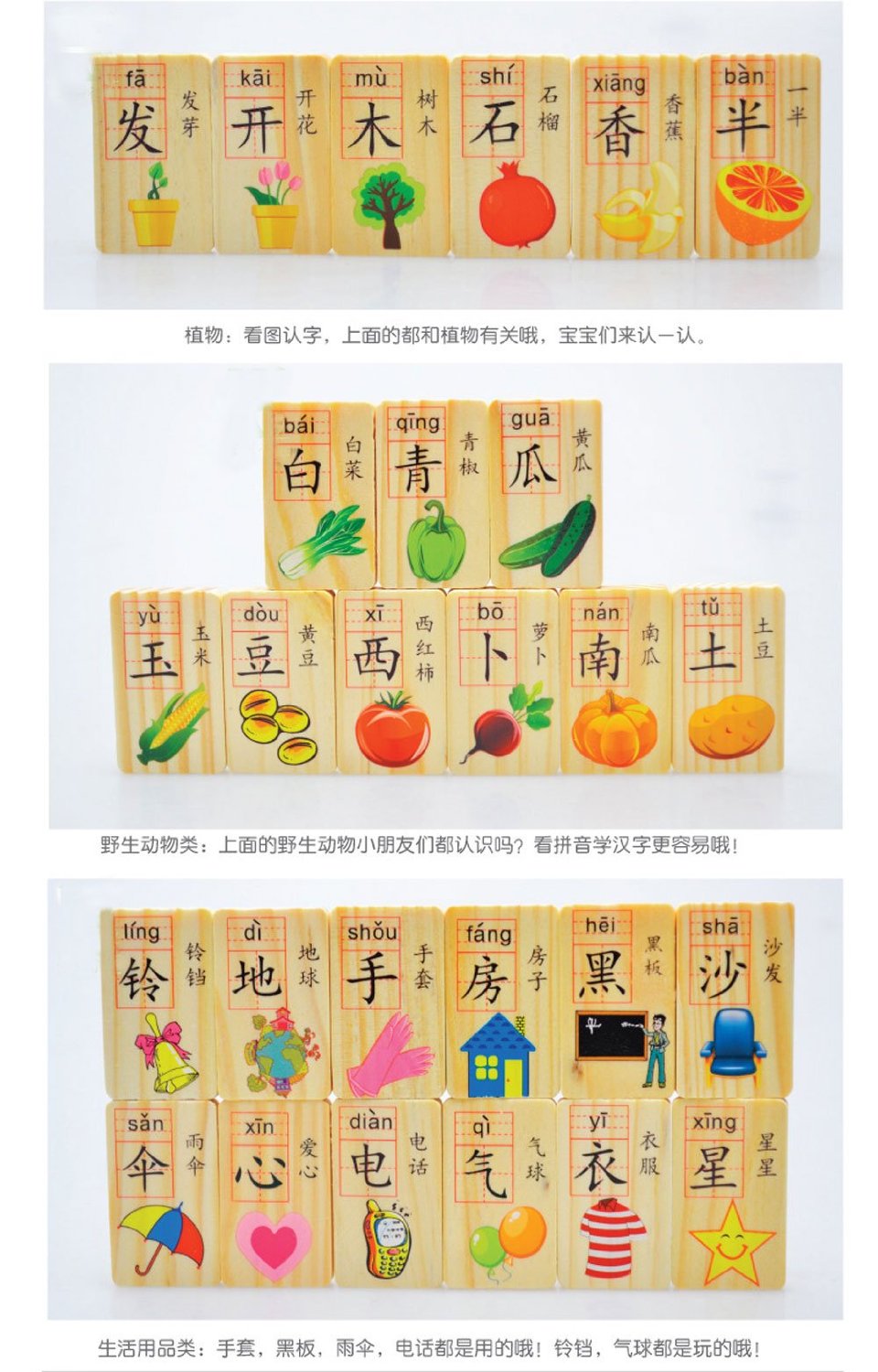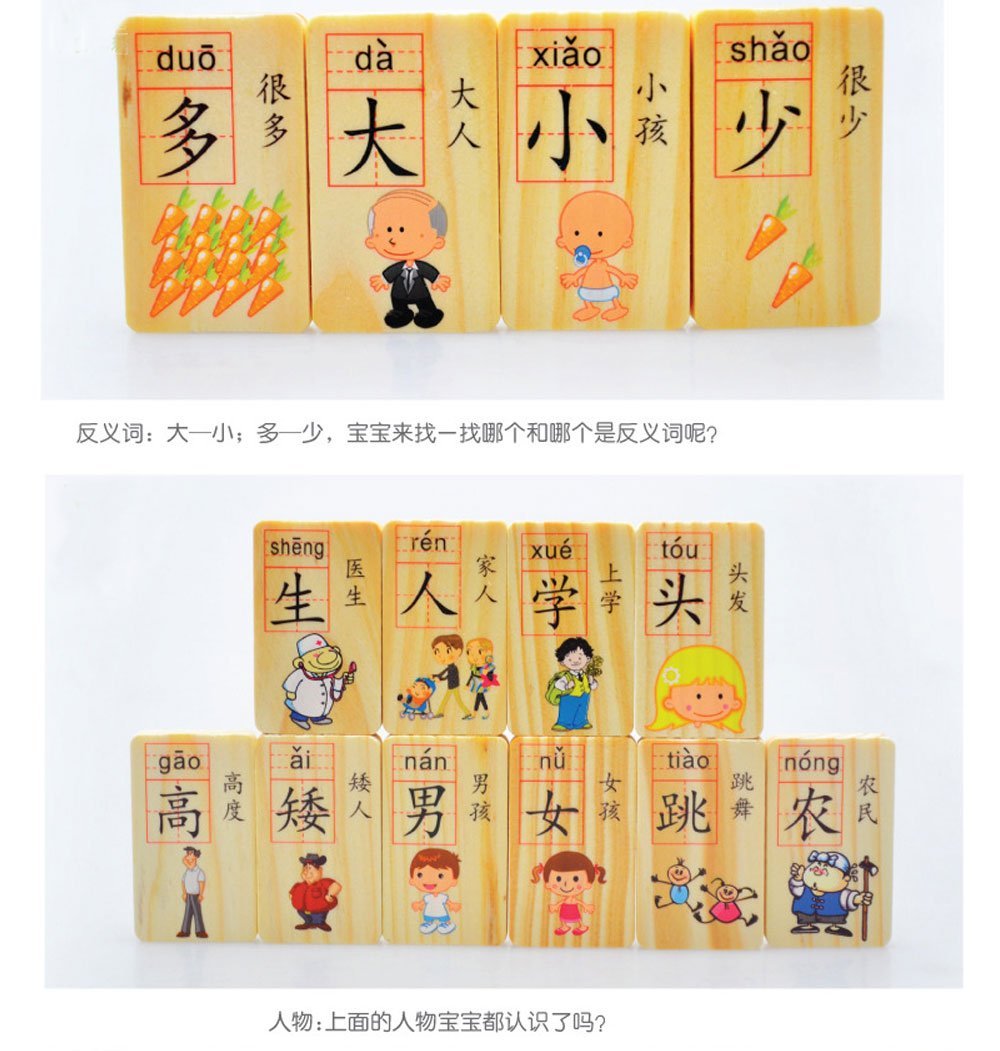 - โดมิโน่คำศัพท์ภาษาจีนแต่ละชิ้น จะมีตัวอักษรจีน พินพิน(pinyin) ตัวอย่างการใช้คำศัพท์นั้น พร้อมด้วยรูปภาพสี่สี